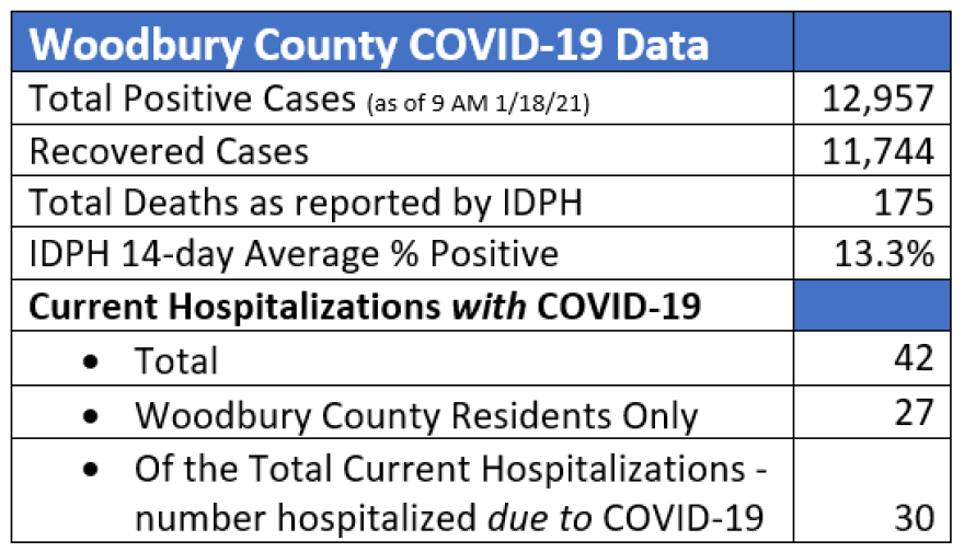 In the most recent trend report, Woodbury County Health officials report the COVID-19 vaccine is currently going out to long term care facilities and health care professionals. They anticipate the first doses will be completed for these groups by February 1. Residents are still encouraged to continue efforts to help control the virus. That includes wearing masks, staying home when even mildly ill, or if you had close contact with someone diagnosed with the virus, wash hands frequently, and avoid gatherings with groups outside of your household.